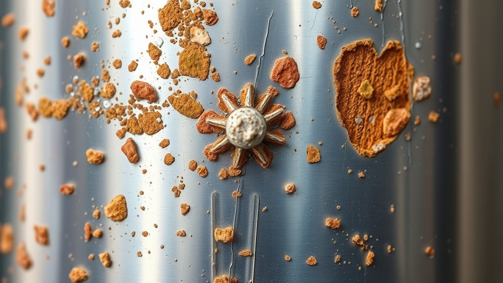 You’ll notice signs like reduced water flow, inconsistent hot water, or longer heating times, indicating scale formation is affecting your water heater. You may also hear banging sounds or see mineral buildup around the tank. These issues lower water heater performance and can lead to early failure. If you observe these signs, it’s time to address scale buildup to guarantee maximum efficiency and extend your water heater’s lifespan.