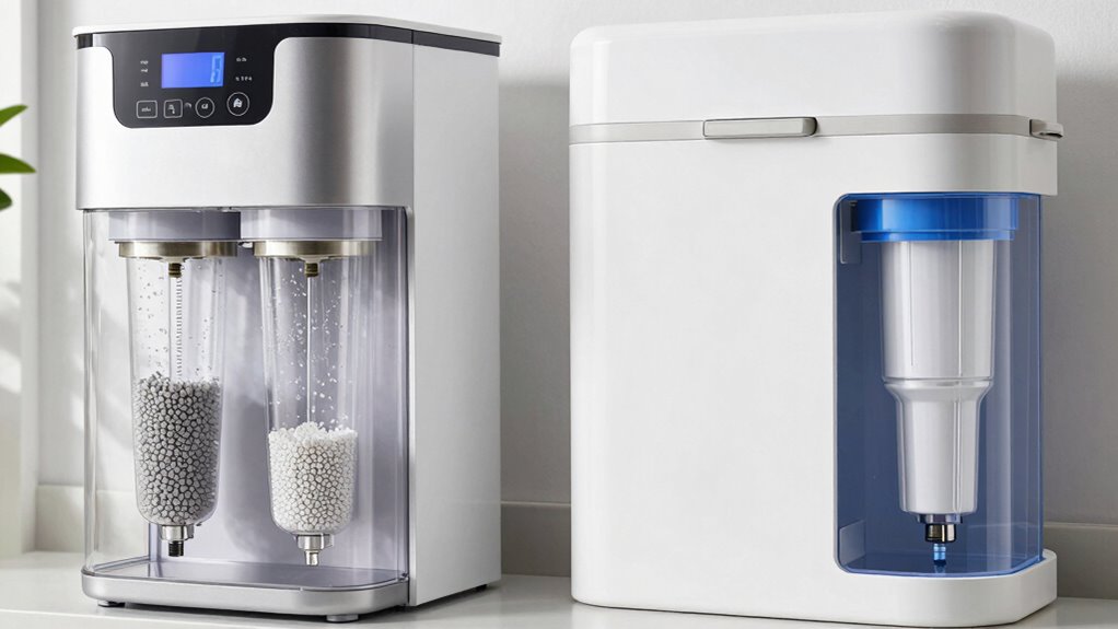 A water softener removes calcium and magnesium ions through ion exchange, effectively preventing scale buildup in appliances and plumbing. A salt-free conditioner, on the other hand, alters mineral behavior using template-assisted crystallization, which keeps minerals dissolved but prevents surface deposits. Softeners are ideal if mineral accumulation causes problems, while salt-free systems suit those wanting scale control without removing minerals. Keep exploring to see which solution best fits your water issues.