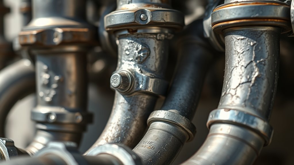 Loose pipe fittings are a common cause of noisy pipes because they allow movement and vibration within the plumbing system. When fittings aren’t tightly secured, pipes can shift or rattle, creating banging or clanking sounds. To reduce this noise, you can add pipe insulation around the loose fittings, which helps absorb vibrations and dampen sound. Properly securing fittings with the right tools and ensuring they’re tight prevents movement that causes noise. Using noise dampening materials or padding around the fittings can also help minimize sound transmission. Regular inspection of fittings, especially after maintenance or repairs, ensures they stay secure and reduces the chances of noise caused by looseness. Keeping fittings tight and well-insulated is key to maintaining a quiet, efficient plumbing system.