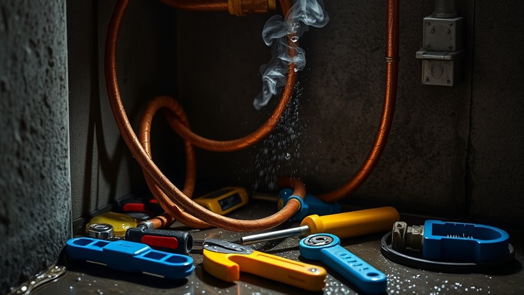 You should use specialized tools like acoustic leak detectors and endoscopes for pipe inspection and noise diagnosis. Acoustic sensors help pinpoint the source of noise by detecting sound vibrations, while borescopes allow you to visually inspect the pipe interior for blockages or damage. These tools enable quick, accurate assessments, making it easier to identify and fix noisy pipes efficiently, ensuring peak performance and avoiding costly repairs later.