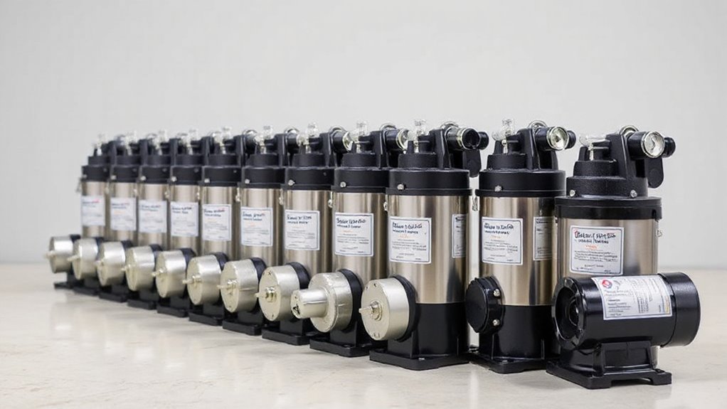 Choosing the right pressure control options is essential because they directly impact how smoothly your booster pump operates and how well it maintains consistent water pressure. Adjustable pressure switches let me set my desired pressure within a typical range of 30 to 60 PSI, giving flexibility for different systems. Some pumps have automatic regulation via built-in or external sensors, ensuring steady pressure despite demand fluctuations. I also appreciate manual pressure adjustment screws, which allow fine-tuning to match specific needs. To protect my system, I consider pressure relief or safety valves that prevent excessive pressure buildup. For added convenience and precision, electronic or smart controllers provide real-time monitoring, programmable settings, and remote control, making managing water pressure more straightforward and reliable.