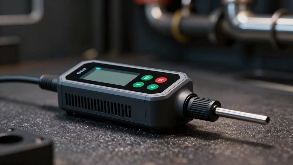Device portability features are key to guaranteeing that your acoustic leak detector performs reliably across diverse job sites. A lightweight device, ideally under 1 pound, makes it easier to handle during long hours. Its compact design allows it to fit into toolkits or pockets, so you can carry it effortlessly between locations. Rechargeable batteries providing 5-8 hours of continuous use reduce the need for frequent recharging and keep you focused on the job. Wireless operation or minimal cabling enhances maneuverability, letting you access tight or hard-to-reach spaces without hassle. Additionally, a durable, impact-resistant casing ensures the device withstands tough environments while maintaining its portability. These features collectively guarantee reliable, flexible performance, no matter where or how you’re working.