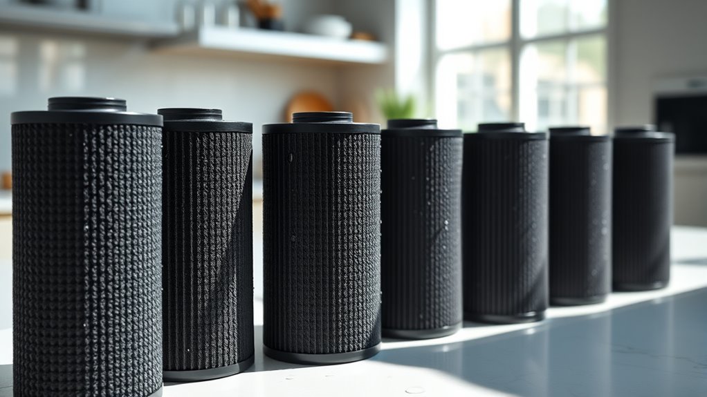 Understanding the types of contaminants in your well water is essential for choosing the right carbon block filter. These filters are excellent at removing chlorine, chloramine, VOCs, and some heavy metals, which improve taste and odor. They’re also effective at filtering out organic contaminants that cause discoloration and bad smells. However, their capacity to eliminate nitrates and bacteria is limited without extra treatment stages. If your water has high iron, manganese, or sulfur, you’ll need specialized filters alongside your carbon block for all-encompassing purification. The pore size of the filter, such as 1 or 5 microns, influences its ability to trap microscopic particles and pathogens, affecting overall water quality. Knowing what contaminants are present helps you select the most suitable filter for safe, clean well water.