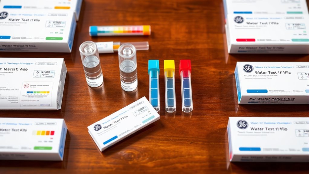 Choosing the right GE water test kit starts with examining its testing range and parameters. I look for kits that cover all relevant contaminants for my water source, like heavy metals, bacteria, pH, and chemicals. It’s crucial to verify the detection limits to ensure the kit can identify both safe and unsafe levels, such as lead below EPA action levels. I also check if the testing range aligns with typical contaminant concentrations in my water, especially for specific concerns like nitrates in well water or chlorine in city water. Additionally, I consider how many parameters the kit tests at once, valuing extensive kits that provide a broader picture of water safety. Making sure these factors match my needs helps me choose an effective and reliable test kit.