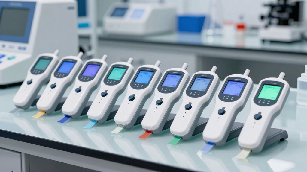 A handheld colorimeter’s portability is key to guaranteeing effective water testing in diverse settings. I look for devices that are lightweight and compact, making it easy to carry and use on the spot. A durable casing is essential, especially since field conditions can be tough, and the device needs to withstand handling and environmental factors. Long-lasting, rechargeable batteries or smart power management ensure I can test for extended periods without worrying about power loss, especially in remote locations. An ergonomic shape improves grip, reducing fatigue during prolonged testing sessions. Additional features like a protective carrying case or waterproof certification add to the device’s portability, safeguarding it against damage and making it reliable in various environments. These features collectively guarantee my testing process remains smooth and efficient.