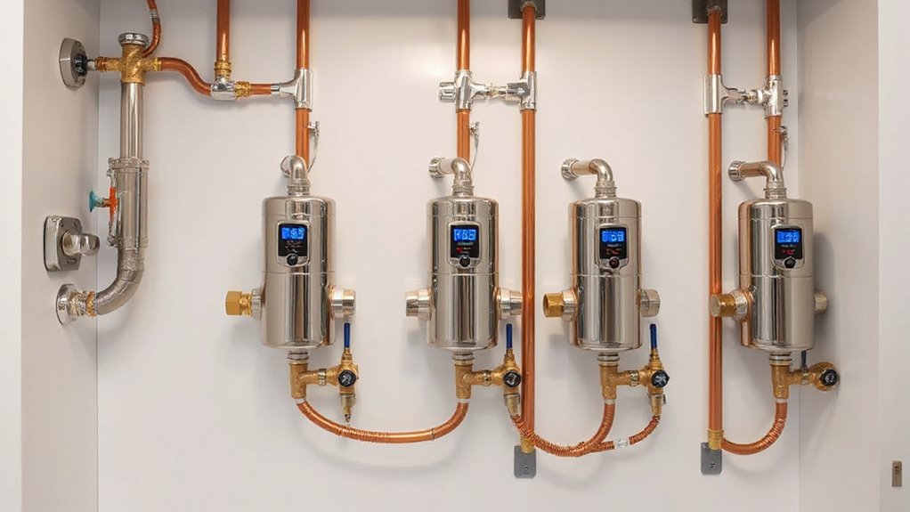 Recirculation pumps boost water heating efficiency by reducing the wait time for hot water, which means I use less energy to keep water hot throughout my home. They circulate hot water through pipes constantly or on demand, preventing heat loss and minimizing energy waste. This not only saves me money but also guarantees I have hot water instantly available, making my system more efficient and eco-friendly.