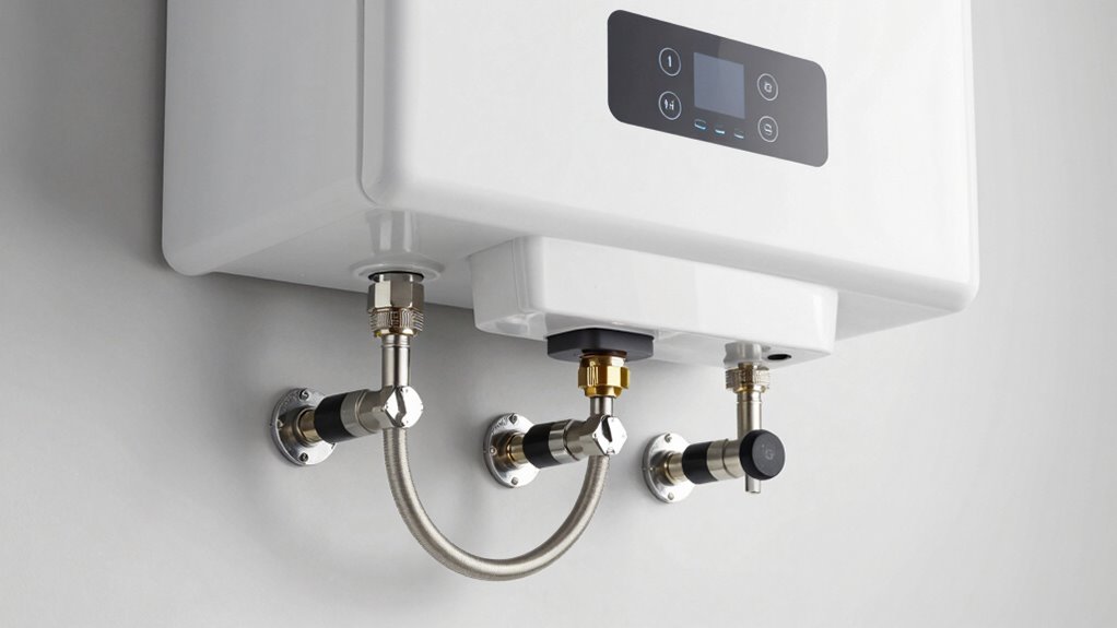 Choosing a smart water heater leak shutoff kit requires careful attention to plumbing compatibility to guarantee a secure and reliable connection. First, check that the valve fittings match your home’s pipe sizes, whether it’s ½”, ¾”, 1”, or larger. Make sure the system supports your plumbing materials, like copper, PVC, or PEX, to avoid leaks or damage. Confirm that the shutoff mechanism fits the specific water heater or appliance connection type you have. Also, verify if the installation method—inline, threaded, or clamp-based—aligns with your existing setup. Finally, consider whether the kit’s valve and sensor components can be integrated seamlessly without extra adapters or modifications. Compatibility ensures the kit works effectively and prevents installation issues down the line.