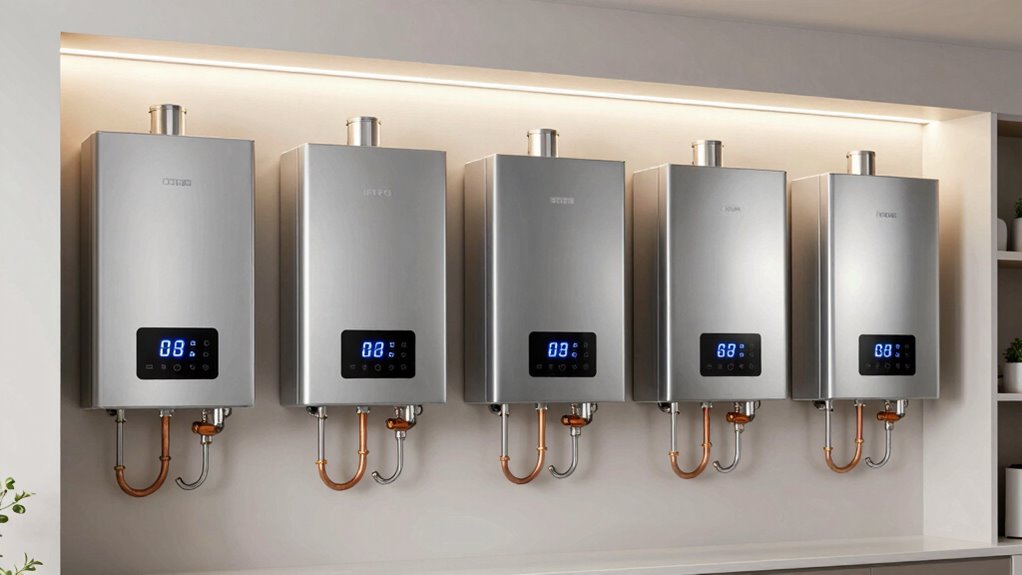 When selecting a tankless water heater with built-in recirculation, I consider factors like installation requirements and how well the system matches my home’s plumbing. I also look at features that promote efficient water recirculation and energy use, along with the unit’s durability and ease of maintenance. These points help guarantee I choose a system that’s reliable, efficient, and suited to my needs.