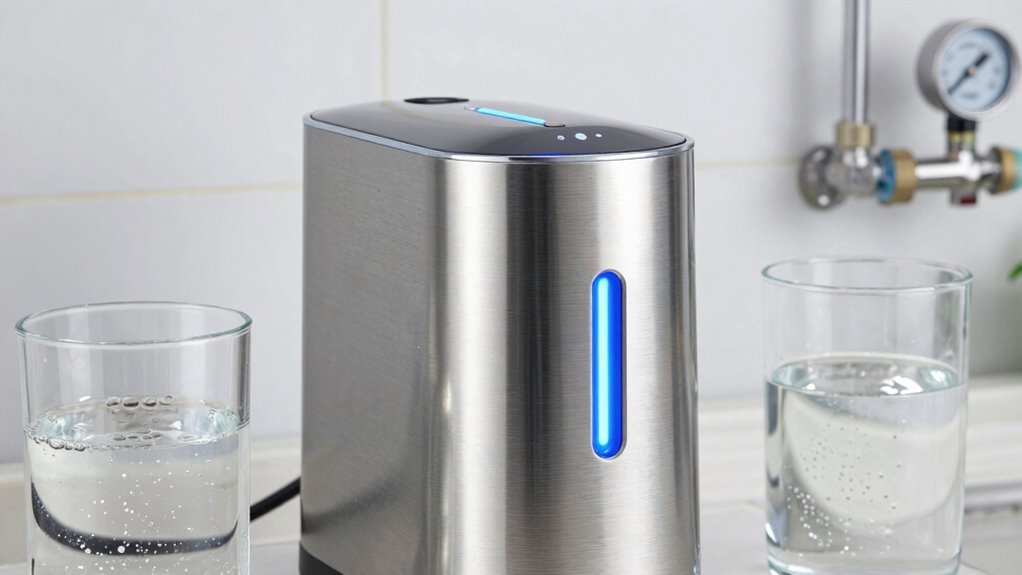 I recommend replacing UV bulbs every 12 months to guarantee peak sterilization. Over time, the bulb’s UV intensity diminishes, reducing its effectiveness against bacteria and viruses. I always keep track of the date I installed mine and set a reminder. If your water flow slows down or you notice a decrease in water quality, it might be time to replace the bulb sooner. Regular maintenance keeps your system working efficiently.