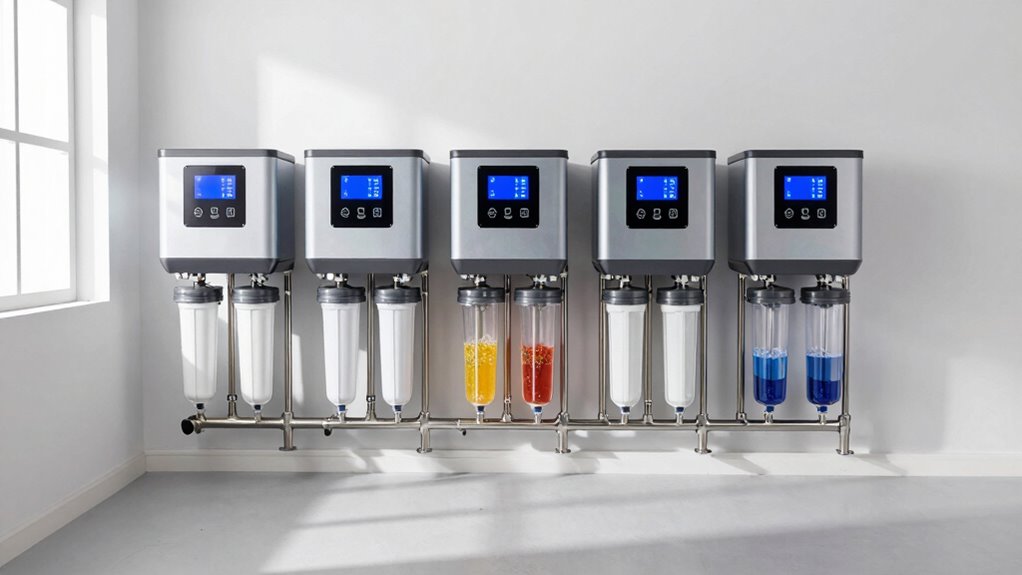 Modern water softener systems leverage advanced technology to provide efficient and reliable softening. They use ion exchange technology to swap calcium and magnesium ions for sodium or potassium, effectively reducing hardness. Digital control panels with programmable settings let you customize regeneration cycles based on your water usage, optimizing efficiency and saving salt. Some systems include multi-stage filtration—sediment, carbon, and specialty filters—to remove contaminants like chlorine, VOCs, and heavy metals, ensuring cleaner water. Many models feature automatic backwash and regeneration functions that conserve water and salt, maintaining consistent soft water output. Additionally, smart features like Wi-Fi connectivity and remote monitoring allow you to track performance and maintenance via mobile apps, giving you greater control and peace of mind.
