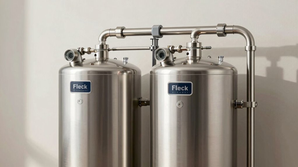 Choosing a water softener with the Fleck 9100SXT dual tank becomes much easier when you prioritize systems with straightforward installation and maintenance instructions. Systems with clear, detailed guides help me perform routine upkeep confidently. I look for models with easy-to-access resin tanks and control valves, making inspections and resin changes quick and hassle-free. Automatic or flow-meter-based regeneration features are a big plus, as they reduce manual interventions and lower maintenance frequency. Durability matters, so I prefer units built from corrosion-resistant materials to minimize repairs over time. Additionally, support resources like instructional videos or responsive customer service make maintenance tasks smoother. By focusing on these factors, I can keep my water softener running efficiently without unnecessary complications.